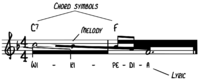 - A lead sheet specifies only the melody, lyrics and harmony, using one staff with chord symbols placed above and lyrics below. It is used to capture the essential elements of a popular song without specifying how the song should be arranged or performed.