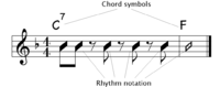 - A chord chart or "chart" contains little or no melodic information at all but provides detailed harmonic and rhythmic information, using slash notation and rhythmic notation. This is the most common kind of written music used by professional session musicians playing jazz or other forms of popular music and is intended primarily for the rhythm section (usually containing piano, guitar, bass and drums).